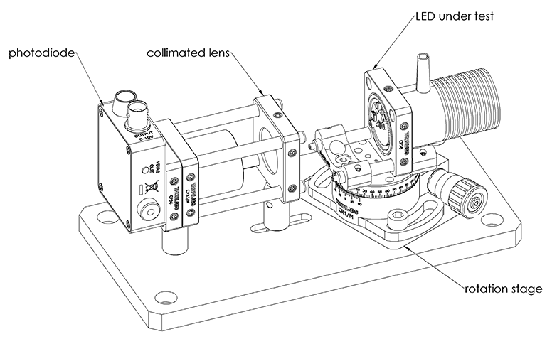 To measure the angular distribution of ray intensities emitted by the LED, I made the setup of Figure 2 which is available [∞] here for reproduction for all our [∞] Premium members. The system is composed of a rotation stage, a collimated lens, a pinhole and a photodiode.