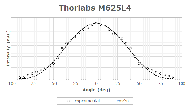 As an illustration, I mapped the angular spectrum of Thorlabs M625L4 LED in Figure 3 and compared it to a cosn model.