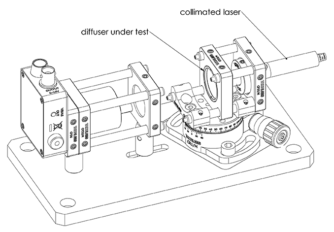 The modified setup to measure diffusers is given in Figure 4. A collimated laser is used as a source in place of the LED of Figure 2 but the measurement principle stays the same. As for the LED setup in Figure 2, it is important that the emission point (the diffuser plate) is coincident with the pivot axis of the rotation stage. All CAD files are also included in the package provided [∞] here.