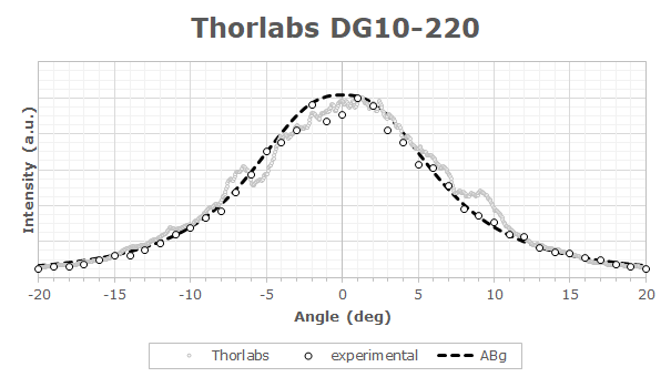 An experimental measurement of the ABg model of Thorlabs ground glass diffuser DG10-220 is given in Figure 5 along with a typical measurement provided by Thorlabs on a different sample. There is good agreement between the acquired data and both the data provided by Thorlabs as well as the ABg fit with an rms error of 4% between the model and the experimental data. Most of the error is due to what seems to be happening on-axis with the diffuser (θ≈0°).