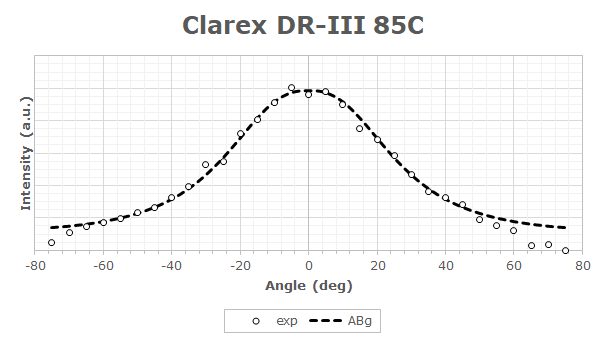 The ground glass diffuser of Figure 5 is however not desirable as a backlight because the diffusion cone is too small (the intensity drops too quickly). Here, I opted for a Clarex DR-III 85C acrylic diffuser, for which the experimental data as well as the fit is provided in Figure 6. You can see that the diffusion cone is much larger this time. Note as well that the data is noisier because the light from the laser is scattered much more than with the narrower ground glass diffuser, leading to overall lower light intensities on the photodiode. Nonetheless, the fit is extremely satisfactory on a 120° diffusion angle although the extreme tail doesnt seem to be modeled correctly by the ABg model.