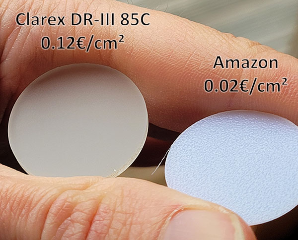 Also, due to the price of the Clarex diffuser, I initially tried to go for cheaper Chinese diffusers bought on Amazon but the results where not satisfactory at all. There was a lot of grain on the cheap diffuser, it melted during machining, and it blocked a lot of the incoming light. You can check a picture of the two diffusers side-by-side in Figure 7.