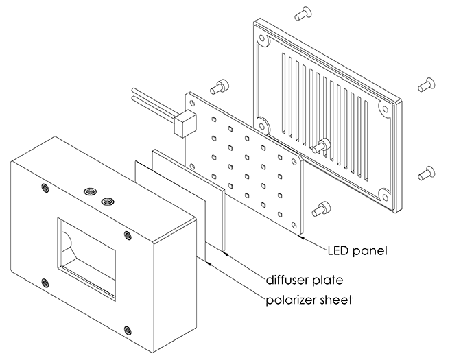 The backlight follows a classical standard backlight architecture shown in Figure 1. A LED panel provides the illumination and a diffuser, placed at a specific distance, homogenizes the output. A polarizer sheet is introduced in front of the diffuser to create linearly polarized light, and the enclosure provides a 40×30 mm² square aperture in addition to several mounting holes. As always, the complete CAD (including Gerber files for the LED panel) is available [∞] here for free for all our [∞] Premium members for reproduction.