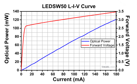 Figure 4 displays the characteristics of the LED being used (LEDSW50 from Thorlabs). We see that near ~30 mA the voltage drop of a LED is around 2.75 V, yielding a thermal power of ~0.08 W. At 40 mA, the voltage drop is a bit higher, yielding a thermal power of ~0.11 W. A target of 35 mA seems then to be a good starting point for our circuit. Note that this is purely drawn based on the assumption that we can dissipate 0.1 W of thermal power per LED, without even questioning the number or the fact that our circuit is enclosed in a box and contains multiple LEDs in total. Experimentation is therefore required to validate or fine-tune our assertion but you can consider these values as a safe boundary. With proper cooling and a metal-core PCB, I have seen LEDs draw as much as 3 Watt of thermal power in steady state operations for a total electrical power of 200 Watts and optical power of 80 Watts!