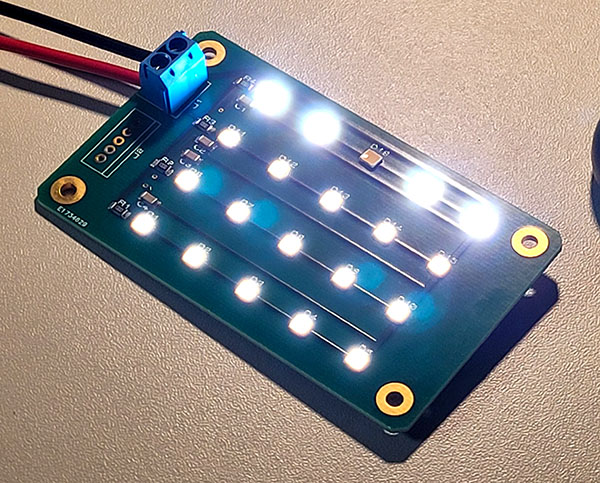 Second, and this was not expected at all when I designed the circuit of Figure 3, a thermal flaw in one of the LED of a string will likely cascade to all other LEDs in that string. If your LED shorts at full power due to a thermal fault (i.e. by over-heating), the local voltage drop will become zero and the other LED current will therefore increase making them even hotter and more likely to have thermal fault on their own. This is illustrated in Figure 5 where one of the LED was faulty, probably due to over-heating during soldering operations, which made the other LED of the string draw more current. In Figure 5, this translates by having brighter LEDs in the top row compared to the other rows.