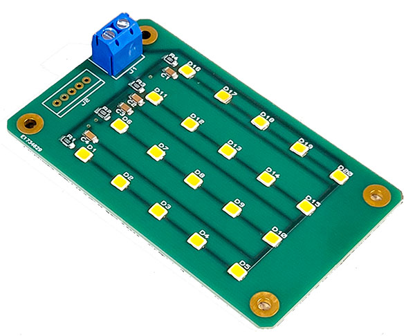A photography of the final PCB is shown in Figure 2. Normally, you would want to use a metal-core PCB to remove the heat from the LEDs, but I couldnt afford one and so I used standard FR4 for my prototype. This does not change the homogeneity of the backlight but reduces the amount of optical power to about 600 mW. In theory, with proper heat management, the same backlight could produce as much as 2,500 mW of optical power!