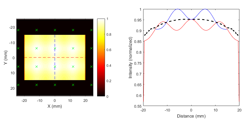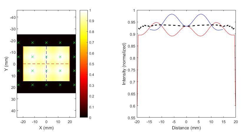 A typical result is shown in Figure 7, which corresponds to the backlight of Figure 1 and LED panel of Figure 2. On the left-hand side of the figure, you can see the expected homogeneity over my 40×30 mm² aperture with the LED placement shown in green. On the right-hand side of the figure, you can see a cross section of the light intensity for the middle row and middle column of the backlight, as well as the mean radial profile in dashed lines. The homogeneity of this backlight is therefore expected to be 90% over a disk a 30 mm and better than 85% over its full field of view.