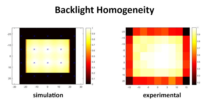 Based on simulations, we can now try to tweak our backlight to achieve better homogeneity than the one in Figure 7. If you pay attention to the results of Figure 7, you will notice that there is a drop in intensity that is approximately quadratic with distance to center. If we could fix that profile, we would gain a lot at the edge of the backlight. Similarly, for a given imaging system such as the one of Figure 8, we could also compensate for illumination losses by making the backlight artificially brighter at the edge to compensate for the imaging system.