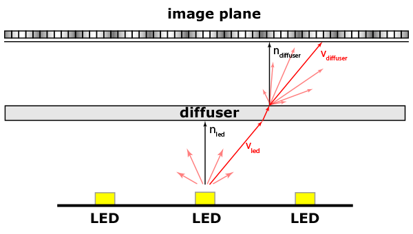 The overall simulation process is shown in Figure 6. Each LED emits multiple primary rays to the diffuser plate and each ray hitting the diffuser plate is then scattered into multiple secondary rays that propagate up to the image plane. The intensity of each primary ray exiting the LED is given using a cosn model from the ray direction, vled, compared to the LED orientation, nled. The intensity of each secondary ray exiting the diffuser is given by an ABg model which takes as input the direction of the primary ray, vled, orientation of the diffuser plate, ndiffuser, and direction of the secondary ray, vdiffuser.