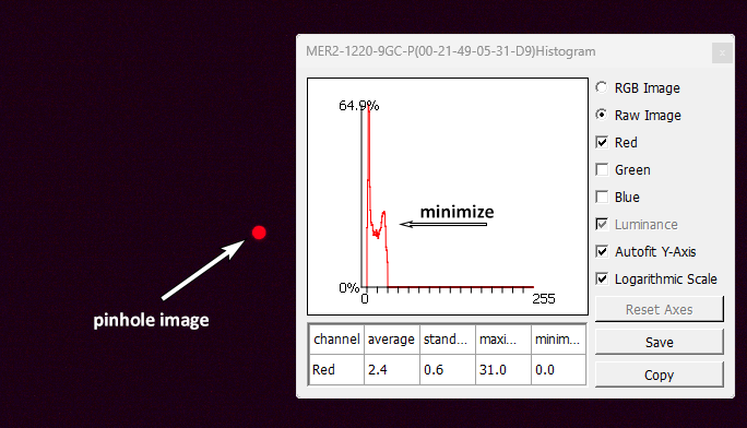 When performing the alignment of the system shown in Figure 1, set the camera exposure to ~100 ms (or any other required exposure time to achieve a mean gray value at 80% saturation of the camera) and tune the polarizer axis until the camera grayscale values histogram shows a minimum as shown in Figure 2. For those who replicate the setup using the [∞] provided CAD, you can use a current source of 25 mA for the LED.