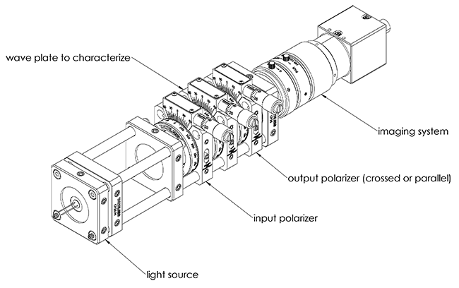 Experimentally, we will re-use our [»] 3-polarizers system except, this time, we will introduce our wave plate between two polarizers. The setup is shown in Figure 1. The input polarization axis is not important but the output polarizer must be accurately set to parallel or crossed configuration using the strategy explained in our [»] previous post.