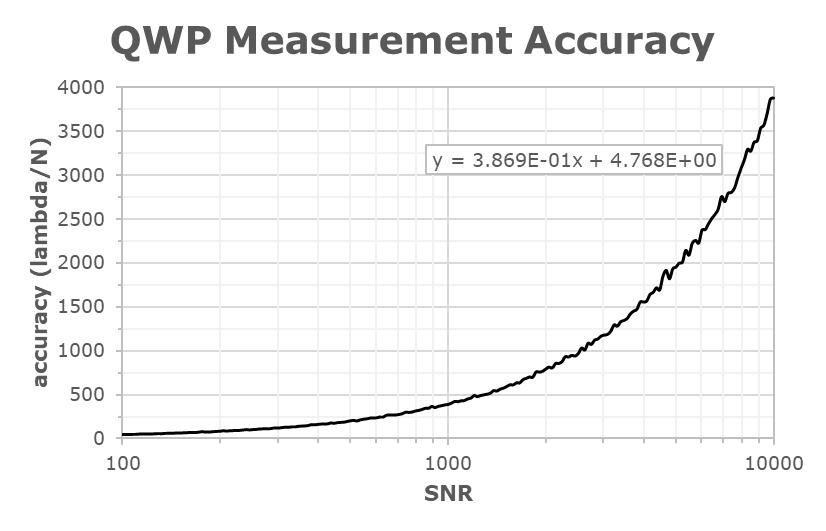 Second, the 95% error was evaluated for increasing SNR values. The results are shown in Figure 3. They show that a SNR of at least 2,572 is required to achieve a λ/1000 accuracy on the retardance measurement. Using a typical camera of SNR=100, this corresponds to averaging at least 662 pixels or frames. Interestingly, the accuracy seems to follow an exact linear pattern vs. SNR.