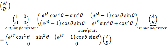 When studying [»] birefringence, we saw that rotating a birefringent sample between two crossed polarizers or two parallel polarizers was modifying the light intensity passing through the complete system. Using [»] Jones calculus, we can write our polarizer/wave plate/polarizer system as