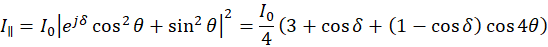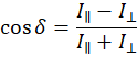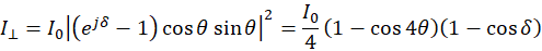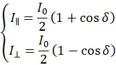 Only the second solution is of interest. It shows that the intensity either increases or drops based on the cosine of the retardance value. When this cosine is zero (δ=(2k+1)ϖ/2, quarter-wave plates), the intensity is the same in both configurations. When this cosine is maximum (δ=(2k+1)ϖ, half-wave plates), the difference in intensity is maximum. Measuring the difference in intensity between the two configurations therefore gives an indication of the value of the retardance cosine if we know the intensity I0.
