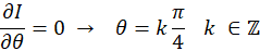 Both configurations show a variation of the intensity with the quadruple of the angle θ, something that we already saw in our [»] birefringence experiment. Mathematically, we can locate extremas by looking at the first and second derivatives of the intensity in regards to the angle θ